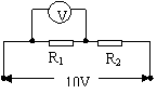 10、两定值电阻R1、R2串联后接在电压恒等于10V的直流电源上。某学生把内阻不是远大于R1、R2的电压表接在R1两端,如图所示,电压表示数为6V。如果把此电压表改接在R2两端,则电压表示数将:( )