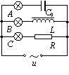 6. 如图所示,三只完全相同的灯泡A、B、C分别与电容器、电感线圈和电阻串联后接在同一交流电源上,供电电压瞬时值为u1=Umsinω1t,此时三只灯泡亮度相同。现换另一个电源供电,供电电压瞬时值为u2=Umsinω2t,ω2=2ω1。则改换电源后