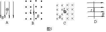 10.如图5所示的四种情况,通电导体均置于匀强磁场中,其中通电导线不受安培力的是 ( )