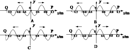 如图所示,波源S的起振方向向上,振动频率f=100Hz,产生的简谐波分别沿水平方向左右传播,波速v=80m/s,在波的传播方向上有P、Q两点,已知SP=1.2m,SQ=1.4m。则波刚好传播到P点时波形图正确的是: