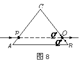⑶一个等腰直角三棱镜的截面如图8所示,一细束绿光从AC面的P点沿平行底面AB方向射入棱镜后,经AB面反射,再从BC面的Q点射出,且有PQ∥AB(图中未画光在棱镜内的光路).如果将一细束蓝光沿同样的路径从P点射入三棱镜,则从BC面射出的光线是_▲_