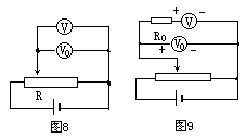 14.自己修理过的一个量程为5V的电压表按下述方法校验。先按图8接好电路,V0为标准电压表,V为待校准的电压表。移动变阻器R上的滑动触头,到V满刻度值是5V时,V0示数为4.5V。再按图9电路将待校电压表串联一个标准电阻R0,R0的大小为2.7kΩ,重新移动变阻器R的滑动触头,当待校表V的指针仍偏转到满刻度值时,V0示数为9V。问应采取什么措施来调准这个刚修好的电压表?