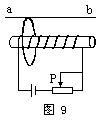 9.如图9所示,光滑杆ab上套有一闭合金属环,环中有一个通电螺线管。现让滑动变阻器的滑片P迅速滑动,则 [ ]