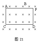 21.将矩形线圈垂直于磁场方向放在匀强磁场中,如图21所示。将线圈在磁场中上下平移时,其感应电流为____;将线圈前后平移时,其感应电流为____;以AF为轴转动时,其感应电流方向为____;以AC为轴转动时,其感应电流方向为____;沿任意方向移出磁场时,其感应电流方向为____。
