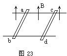 23.如图23,互相平行的两条金属轨道固定在同一水平面上,上面架着两根互相平行的铜棒ab和cd,磁场方向竖直向上。如不改变磁感强度方向而仅改变其大小,使ab和cd相向运动,则B应____。