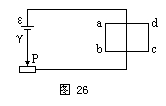 26.如图26所示,闭合导线框abcd与闭合电路共面放置,且恰好一半面积在闭合电路内部。当滑动变阻器的滑片P向右滑动时,导线框abcd中的感应电流方向是____,导线框abcd所受磁场力方向是____。