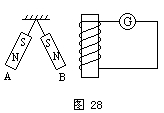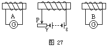 27.如图27,当把滑动变阻器的滑片P从右向左滑动时,在线圈A中感应电流的方向是从____端流进电流表,从____端流出;在线圈B中感应电流的方向是从____端流进电流表,从____端流出。