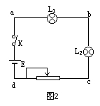 5.如图2所示,因线路故障,按通K时,灯L1和L2均不亮,用电压表测得Uab=0,Ubc=0,Ucd=4V.由此可知开路处为 [ ]