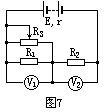 12.如图7所示,当滑动变阻器R3的滑动片向右移动时,两电压表示数变化的绝对值分别是△U1和△U2,则下列结论正确的是 [ ]