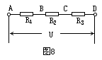 16.在图8所示的电路中,A、D端所加的电压U恒定,R1= R2= R3= 10Ω。用一只理想的电流表接在B、C之间时其示数为0.75A,则若将电流表接在A、C之间时,其示数为______A,若在B、C之间接一只理想的电压表,其示数为______V。