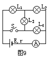 18.四只规格完全相同的灯泡按图9接在电路中,在S断开时,最亮的灯是______,在S闭合时,最亮的灯是____,S由断开到闭合,电流表的示数将______。