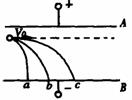 如图所示,有三个质量相等分别带正电、负电和不带电的小球,从平行板电场中的左侧以相同的初速垂直于电场方向进入电场,它们分别落到A、B、C三点,则可以断定 ( )