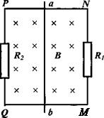 如图,PN与QM两平行金属导轨相距L=1.0 m,电阻不计,两端分别接有电阻R1和R2,且R1=6.0Ω,R2=3.0Ω.导体杆ab的电阻为r=1.0 Ω,在导轨上可无摩擦地滑动,垂直穿过导轨平面的匀强磁场的磁感应强度为B=1.0 T,现ab杆以恒定速度υ=3.0 m/s匀速向右移动。求: