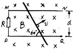 3.如图所示,MN、PQ为平行金属轨道,间距为d,左端接一阻值为R的电阻,匀强磁场的磁感应强度为B,方向垂直纸面指向纸内,一根金属杆放在轨道上,杆与轨道成60°夹角,设杆以垂直于杆的速度v沿轨道滑行,通过R的电流大小是(其它电阻均不计)