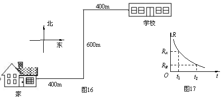 39.某同学的家到学校的直线距离为1000m,但他从家出发步行到学校,要先向东走400m,然后再向北走600m,最后再向东走400m才能到达学校,如图16所示。则他从家到学校的位移大小为 m,走过的路程为 m。