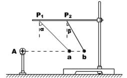 5.如图所示,把一个带正电的小球放在A处,然后把挂在丝线上的带正电小球先后挂在P1 、P2位置。测得丝线两次的偏角分别为α= 45°和β= 30°,而且由于丝线的长度可以调节,两次都确保小球的位置a和b与A在同一条水平线上。如果两带电小球都可以看成点电荷,则两次的间距之比