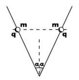 如图所示,真空中两根绝缘细棒组成V字型(α角已知)装置,处于竖直平面内,棒上各串一个质量为m、电量为q的小球,它们可以沿棒无摩擦地滑动,而且总是在同一高度。试求: