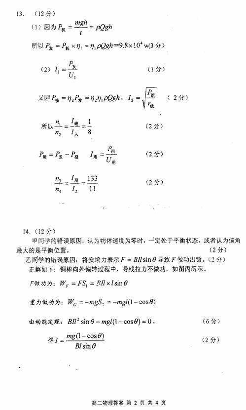 14.(12分)如图甲所示,质量为m,长为l的铜棒,用长度亦为l的两根轻软导线水平悬吊在竖直向上的匀强磁场中,磁感应强度为B,未通电时,轻线在竖直方向,通入恒定电流后,棒向外偏转的最大角度