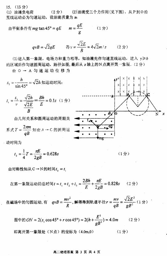 15.(15分) 如图所示,位于竖直平面内的坐标系xoy,在其第三象限空间有沿水平方向的、垂直于纸面向外的匀强磁场,磁感应强度大小为B=0.5T,还有沿x轴负方向的匀强电场,场强大小为E=2N/C.在其第一象限空间有沿y轴负方向的、场强大小也为E的匀强电场,并在y>h=0.4m的区域有磁感应强度也为B的垂直于纸面向里的匀强磁场.一个带电荷量为q的油滴从图中第三象限的P点得到一初速度,恰好能沿PO作直线运动(PO与x轴负方向的夹角为θ=45O),并从原点O进入第一象限.已知重力加速度为g=10m/s,问: