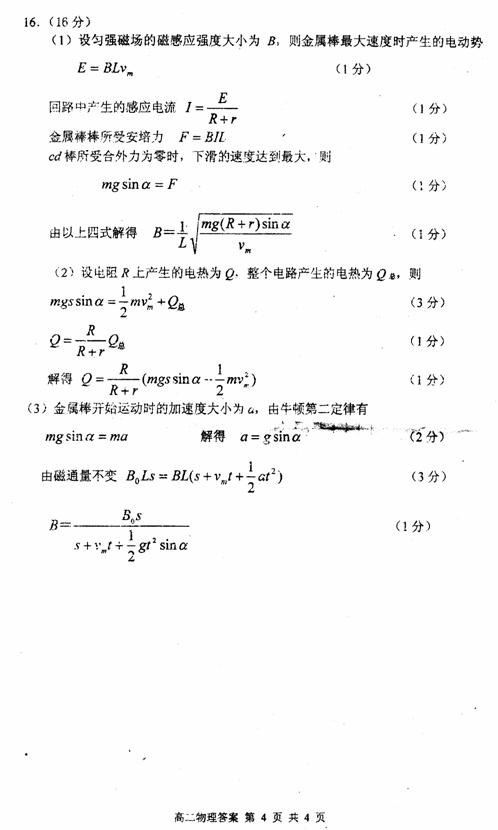 16.(16分)如图所示,两足够长平行光滑的金属导轨MN、PQ相距为L,导轨平面与水平面夹角α,导轨上端跨接一定值电阻R,导轨电阻不计.整个装置处于匀强磁场中,磁场方向垂直于轨道平面向上,长为L的金属棒cd垂直于MN、PQ放置在导轨上,且与导轨保持良好接触,金属棒的质量为m、电阻为r,重力加速度为g,现将金属棒从紧靠NQ处由静止释放,当金属棒沿导轨下滑距离为s时,速度达到最大值vm.求: