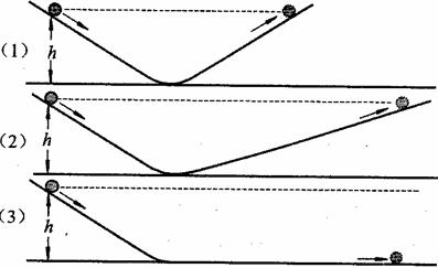 如图(1)所示,把两个斜面对接,让小球由静止开始从左侧斜面上高为h处滚下,如果没有摩擦,小球将达到右侧斜面相同高度的地方。