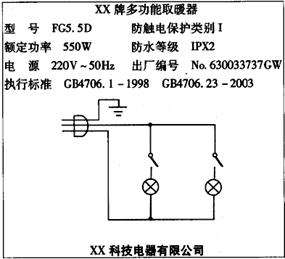 13.浴室取暖器也就是我们常说的“浴霸”,是给浴室加热的电器,它是由几盏特殊的灯泡完成加热工作的。下面是一台浴室取暖器的说明书,上面附有电路原理图,图中有两个相同的加热灯泡。