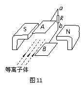(4分)目前世界上正在研究的一种新型发电机叫磁流体发电机,图11表示它的发电原理:将一束等离子体(即高温下电离的气体,含有大量带正电和带负电的微粒,而从整体上来说呈电中性)喷入磁场,由于等离子体在磁场力的作用下运动方向发生偏转,磁场中的两块金属板A和B上就会聚集电荷,从而在两板间产生电压. 请你判断:在图示磁极配置的情况下,金属板 (选填“A”或“B”)的电势较高,通过电阻R的电流方向是