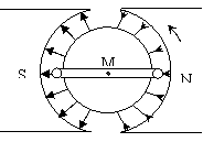 如图所示,为一台发电机结构示意图,其中N、S是永久磁铁的两个磁极,它们的表面呈半圆柱面形状。M是圆柱形铁芯,它与磁极的柱面共轴,铁芯上有一矩形线框,可绕与铁芯M共轴的固定转轴旋转。磁极与铁芯之间的缝隙中形成方向沿半径、大小相等的磁场。若从图示位置开始计时,当线框绕固定转动轴匀速转动时,下列说法中正确的是