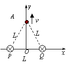 纸面放置,其间距为L,电流强度均为I,方向垂直纸面向里(已知电流为I的长直导线产生的磁场中,距导线r处的磁感应强度B=kI/r,其中k为常数) 。某时刻有一电子(质量为m、电量为e)正好经过y轴的A点,速度大小为v,方向沿y轴正方向,且A点到P与Q的距离均为L,则电子此时所受磁场力为
