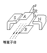 (4分)目前世界上正在研究的一种新型发电机叫磁流体发电机,图表示它的发电原理:将一束等离子体(即高温下电离的气体,含有大量带正电和带负电的微粒,而从整体上来说呈电中性)喷入磁场,由于等离子体在磁场力的作用下运动方向发生偏转,磁场中的两块金属板A和B上就会聚集电荷,从而在两板间产生电压. 请你判断:在图示磁极配置的情况下,金属板 (选填“A”或“B”)的电势较高,通过电阻R的电流方向是