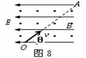 11.质量为m,电荷量为q的微粒以速度v与水平方向成θ角从O点进入方向如图8所示的正交的匀强电场和匀强磁场组成的混合场区, 该微粒在电场力、磁场力和重力的共同作用下,恰好沿直线运动到A,下列说法中正确的是 ( )