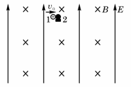 (22分)如图所示,在足够大的空间范围内,同时存在着竖直向上的匀强电场和垂直纸面向里的水平匀强磁场,磁感应强度B=1.57T.小球1带正电,其电量与质量之比q1/m1=4 C/kg,所受重力与电场力的大小相等;小球2不带电,静止放置于固定的水平悬空支架上。小球1向右以v0=23.59 m/s的水平速度与小球2正碰,碰后经过0.75 s再次相碰。设碰撞前后两小球带电情况不发生改变,且始终保持在同一竖直平面内。(取g=10 m/s2),