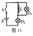 7.如图13所示,E为电池,L是电阻可忽略不计、自感系数足够大的线圈,D1、D2是两个规格相同的灯泡,S是控制电路的开关。对于这个电路,下列说法正确的是 ( )