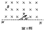 如图所示,在边界MN上方有垂直纸面向里的匀强磁场,一电荷量为q、质量为m的带负电粒子,以垂直于磁场方向与MN成30°角射入磁场区域,速度为v,已知磁场磁感应强度为B,那么粒子射出边界MN的位置与射入位置之间的距离和粒子在磁场中运动的时间分别是: