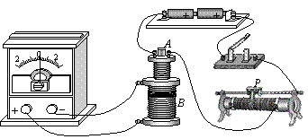 现将电池组、滑线变阻器、带铁芯的线圈A、线圈B、电流计及开关如下图连接。在开关闭合、线圈A放在线圈B中的情况下,某同学发现当他将滑线变阻器的滑动端P向左加速滑动时,电流计指针向右偏转。由此可以判断