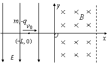 (10分)如图所示,坐标空间中有场强为E的匀强电场和磁感应强度为B的匀强磁场,y轴为两种场的分界面,图中虚线为磁场区域的右边界.现有一质量为m,电荷量为-q的带电粒子从电场中坐标位置(-L,0)处,以初速度v0沿x轴正方向开始运动,且已知