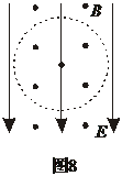 8、如图8所示,在正交的匀强电场和匀强磁场中,一带电粒子在竖直平面内做匀速圆周运动,则粒子的带电性质和环绕方向分别是( )