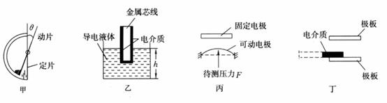 9. 传感器是把非电学物理量(如位移、速度、压力、角度等)转换成电学物理量(如电压、电流、电量等)的一种元件。如图所示中的甲、乙、丙、丁是四种常见的电容式传感器,则下列说法正确的是