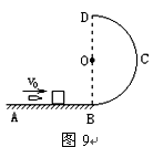 (12分)如图9 所示,AB是光滑水平轨道,BCD是半径为R的光滑半圆弧轨道,两轨道恰好相切.质量为M的小木块静止在A点,一个质量为m的小子弹以某一初速度水平向右射入小木块内,并留在其中和小木块一起运动,恰能到达半圆弧最高点D.木块和子弹均可视为质点,求子弹入射前的速度.