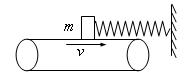 一皮带传送装置如图所示,皮带的速度v足够大,一根质量不计,劲度系数为k的弹簧一端固定,另一端连接一个质量为m的滑块,已知滑块与皮带之间的动摩擦因数为m ,当滑块放在皮带上时,弹簧的轴线恰好水平,若滑块放到皮带的瞬间,滑块的速度为零,且弹簧正好处于自由长度,则当弹簧第一次达到最远时的过程中,求: