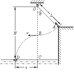 4.(9分)某水上游乐场举办了一场趣味水上比赛.如图所示,质量m=50kg的参赛者(可视为质点),在河岸上A点紧握一根长L=5.0m的不可伸长的轻绳,轻绳另一端系在距离水面高H=10.0m的O点,此时轻绳与竖直方向的夹角为θ=37°,C点是位于O点正下方水面上的一点,距离C点x=4.8m处的D点固定着一只救生圈,O、A、C、D各点均在同一竖直面内.若参赛者抓紧绳端点,从台阶上A点沿垂直于轻绳斜向下以一定的初速度跃出,当摆到O点正下方的B点时松开手,此后恰能落在救生圈内.(sin37°=0.6,cos37°=0.8,
