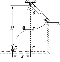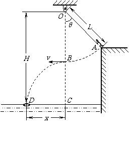 3.(南通市)某水上游乐场举办了一场趣味水上比赛.如图所示,质量m=50kg的参赛者(可视为质点),在河岸上A点紧握一根长L=5.0m的不可伸长的轻绳,轻绳另一端系在距离水面高H=10.0m的O点,此时轻绳与竖直方向的夹角为θ=37°,C点是位于O点正下方水面上的一点,距离C点x=4.8m处的D点固定着一只救生圈,O、A、C、D各点均在同一竖直面内.若参赛者抓紧绳端点,从台阶上A点沿垂直于轻绳斜向下以一定的初速度跃出,当摆到O点正下方的B点时松开手,此后恰能落在救生圈内.(sin37°=0.6,cos37°=0.8,