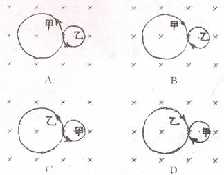 已知磁场方向垂直纸面向里。以下四个图中,能正确表示两粒子子运动轨迹的是( )![]()