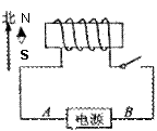 实验室有一个旧的学生直流电源,输出端的符号模糊不清,无法分辨正负极。某同学设计了下面的判断电源两极的方法。在桌面上放一个小磁针,在磁针东面放一个螺线管(如图),闭合开关后,磁针指南的一端向东偏转。下述判断正确的
