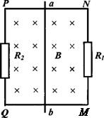 如图,PN与QM两平行金属导轨相距L=1.0 m,电阻不计,两端分别接有电阻R1和R2,且R1=6.0Ω,R2=3.0Ω.导体杆ab的电阻为r=1.0 Ω,在导轨上可无摩擦地滑动,垂直穿过导轨平面的匀强磁场的磁感应强度为B=1.0 T,现ab杆以恒定速度υ=3.0 m/s匀速向右移动。求: