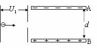 (8分)有一初速为零的电子经电压U1加速后,进入两块间距为d,电压为U2的平行金属板间,若电子从两板正中间垂直电场方向射入,且正好能从B板边缘穿出电场,设电子的电荷量为