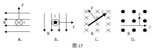 17.如图17所示,表示磁感应强度B,电流I,安培力F的相互关系图,哪个图不正确( )