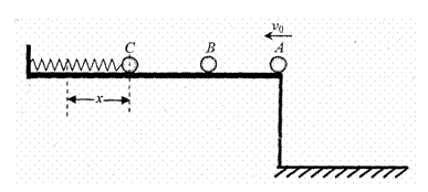 23.(附加题)如图所示,在高为h=1.25m的水平台面上放着两个质量分别为m2=0.2Kg和m3=0.3kg的小球B、C,其中C球用轻质弹簧与左边固定的挡板连接,开始弹簧处于自然长度。C球右侧台面光滑,左侧台面粗糙,各球与左侧台面间的动摩擦因数均为μ=0.2。现有一质量为m1=0.1kg的小球A以v0=10m/s的水平速度向左运动,与B球发生正碰,A球被反弹后从水平台面上飞出,落地点距平台右边缘的水平距离为s=1m。而B球与C球在极短的时间内发生正碰,碰后粘在一起共同压缩弹簧,使弹簧具有最大弹性势能Ep=1.34J;已知三个小球均可看做质点,弹簧的形变在弹性限度内,不计空气阻力,g取10m/s2。
