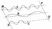 有三根平行的弹性绳A、B、C,其左端在同一直线MN上,让它们的左端同时开始振动,经过一定时间后出现了如图所示情况,其中PQ是平行于MN的一条直线.由图中信息可知( )