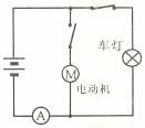 汽车电动机启动时车灯会瞬时变暗,如图,在打开车灯的情况下,电动机未启动时电流表读数为lO A,电动机启动时电流表读数为58 A,若电源电动势为12.5 v,内阻为0.05Ω,电流表内阻不计,则因电动机启动,车灯的电功率降低了 ( )
